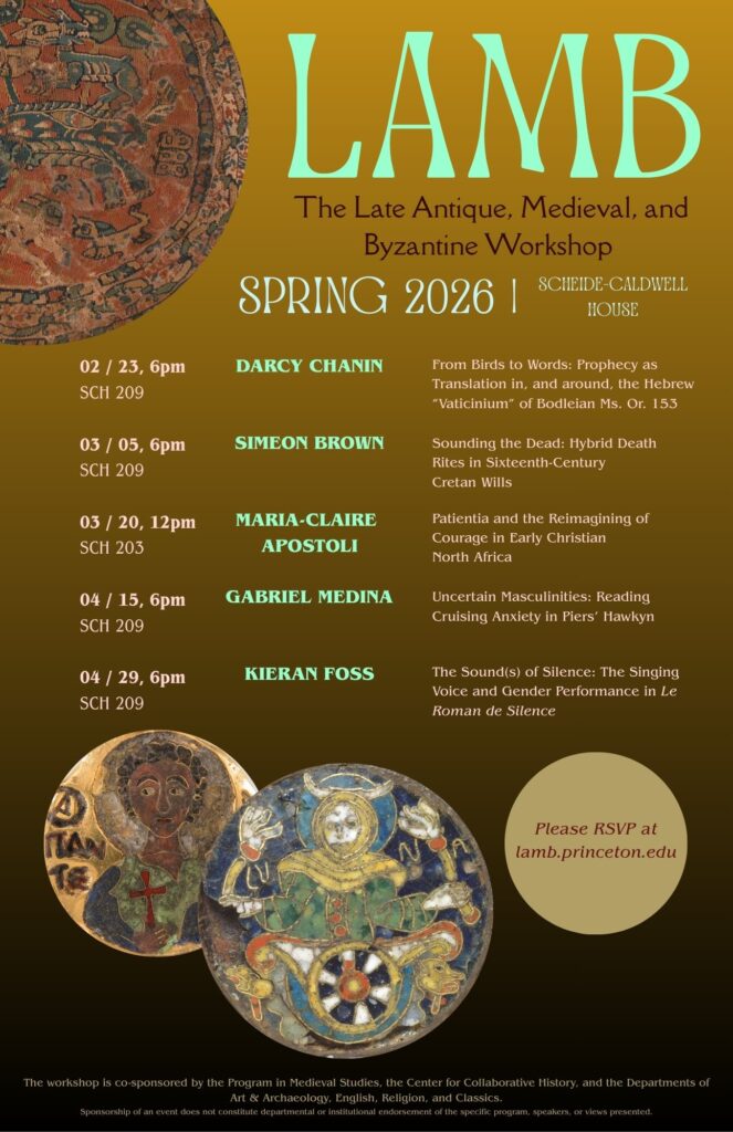 The Late Antique, Medieval, and Byzantine Workshop at Princeton University (LAMB) brings together graduate students from across departments and disciplines who study and research any region ca. 300-1500 CE, and offers an opportunity to present and discuss their research with others from within and outside their fields.